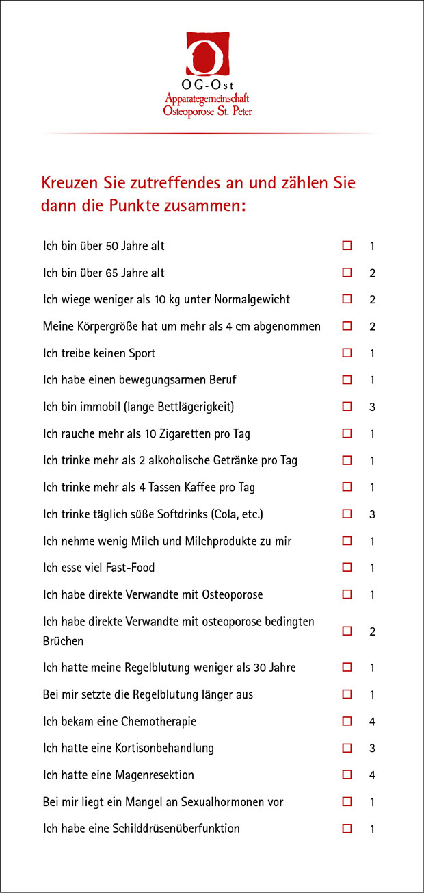 In unserem Test können Sie durch eigene Beobachtungen prüfen, ob bei Ihnen eine erhöhte Wahrscheinlichkeit besteht an Osteoporose zu erkranken.
